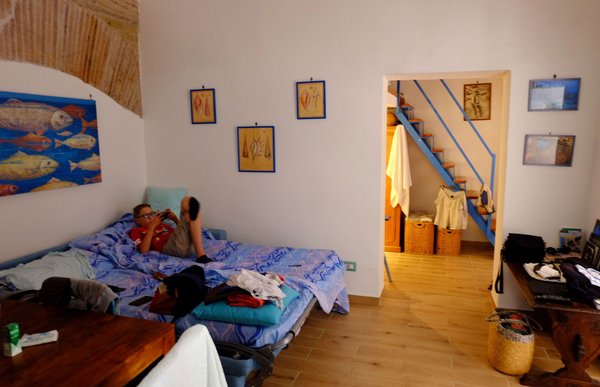 A vicc pedig az volt, hogy a közeli Laterzában éppen egy hasonló barlanglakásban laktunk (ez is airbnb), csak annak jobban kipingálták az elejét, de odabent a gyerekek szobája, mint valami egri vár alatti boros pince, a miénk, beljebb, meg mint egy kicsinyített Aggtelek, kimeszelve. Nagyon állat az ilyen.