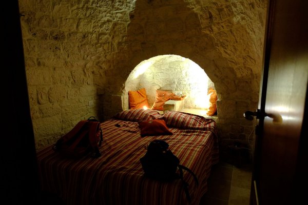 Az elrendezés előnye volt, hogy télen az állatok befűtötték a hőt amúgy is jól tartó trullit, nyáron pedig, amikor azok kint aludtak, a vastag falak és tető, és a pici (vagy leginkább semmilyen) ablakok miatt jó hideg marad odabent a levegő, ahogy ezt mi is megtapasztaltuk. Volt klímaberendezés, de kvázi be se kapcsoltuk, pedig odakint tombolt a hőség. A legjobb szállásunk volt az úton, mondjuk, igényesen is újították fel.