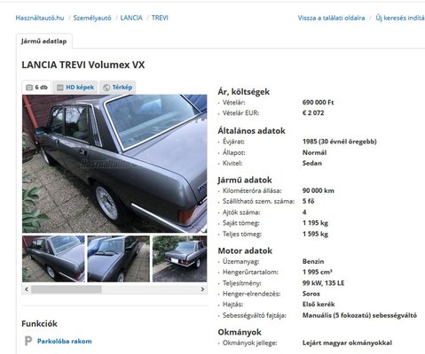 De nem lennék én, ha nem lennék én, vagy hogy is. Mert közben persze felbukkant egy Alfasud Sprint a neten, amit a klubtársaim egyre izgatottabban (én is) egymás közt küldözgettek, full lakat, gyári szövettel megcsinált belső tér, felújított motor, egy teherautónyi alkatrész, először 1,5, aztán 1,2, végül pár napja már csak egymillió volt. Egy ilyen autót otthagyni – bűn. Majdnem elmentem érte, szerencsére valaki megvette. És ott a Lancia Trevi Volumex is, az ementálisajt-műszerfalas, amiből eddig kizárólag szívó benzinest árultak az elmúlt években (azt is másfél millióért), de most felbukkant egy kompresszoros Holy Grail-Volumex, a csúcsváltozat, gyönyörűen tisztába téve, makulátlanul, már csak az üzemanyagrendszer vár átnézésre. Ja, magyar papíros! Most is néztem, még megvan, röhejes, 690 ezres áron. Nem hiszem el...