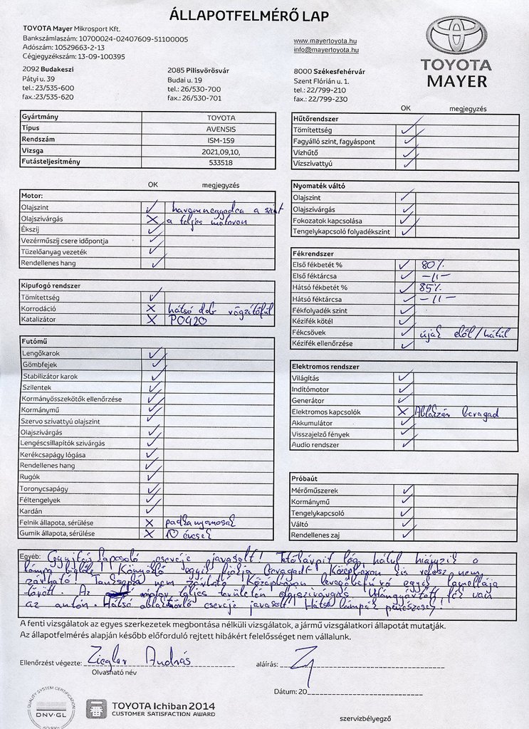 Aki azt hiszi, voltam olyan balga, és egy ilyen drága autót, mint ez az Avensis, alapos átvizsgálás nélkül, hűbelebalázs módjára megvettem, nagyot téved. Nem azért olvasom hétről-hétre Zách Dani cikkeit évek óta, hogy effélére vetemedjek. Naná, hogy mielőtt az ellenértékét átadtam Gábornak, előtte még bejelentkeztem a pilisvörösvári Toyota Mayerhez, hogy megtudjam, nagyjából mire készüljek.
