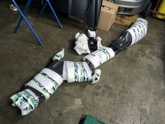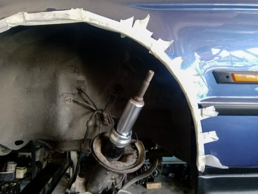 Az első futómű már eredetileg is tartalmazott kimondottan Alpina-alkatrészeket. Innen is kikerült az utángyártott állítható futómű. Megvolt a két eredeti, igen vastag szárú lengéscsillapító, viszont a leszorítócsavarjai nem. Ezt ismét az Alpinától kellett megrendelni, mint ahogy a dekorcsík is tőlük származik, véletlenül sem másolt, ebay-es portéka. Nagy könnyebbséget jelentett a munka során, hogy mivel évek óta elszántan foglalkozom a BMW E34-es sorozatával, van hozzáférésem bármelyik Alpina által kiadott típus teljes alkatrészlistájához cikkszámokkal, képekkel.