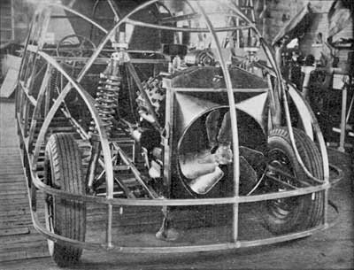 A konkrét megvalósításhoz meglepően kevés vásárolt alkatrészt használtak. A motor ezek közé tartozott: a Ford Flathead V8-asának 85 lóerős változatát építették az autó hátuljába, méghozzá a megszokotthoz képest fordítva, kuplunggal előre. Így előrefelé állt a saját tervezésű, háromfokozatú manuális váltó is, amely viszont a motor alatt csatlakozott a differenciálműhöz. Így viszonylag nagy terhelés jutott a hátsó tengelyre, ami egyrészt javította a hátsó tengely tapadását, csökkentve a megcsúszási hajlamot, másrészt könnyű kormányzást eredményezett. A konstrukciót lengőtengelyes független felfüggesztés tette teljessé, a repülőgépekéhez hasonló olajos lengéscsillapítással, ami a beszámolók szerint kivételesen sima, kényelmes és stabil futáshoz vezetett.