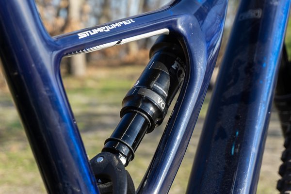 A Stumpy-n ilyen nincs, ez csak simán egy döbbenetesen jól kitalált váz. Elérhető belőle alumínium is, de ez most egy szénszálas változat. Meg mertem volna esküdni, hogy fekete, de amint fény éri, elkezd világítani a kék réteg a lakkozás alatt, az tényleg megállítja a pillanatot. Szép, nem túltolt, ízléses az egész, az aszimmetrikus tagbefogatás meg szimplán menő. A futómű FSR, vagyis a Speci megszokott, fékfüggetlen megoldása, azaz a féknyereg és a hátsó tengely nem a lengővillán, hanem a támvillán kap helyet, így fékezésnél csak minimálisan befolyásolja a mozgást.