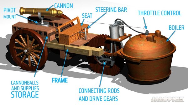Persze ebben a sztoriban nevetségesen sok a ha, és nem is így történt. Mindenesetre Cugnot a fardier à vapeur-al kitűnő példával szolgált, hogy miként lehet mozgásba hozni a dugattyúkat - amik pedig a kerekeket hajtják meg - egy kis hőenergia segítségével. A probléma inkább az volt, amikkel a mai mérnökök is küzdenek egyes autók tökéletesítésekor: súlyeloszlás, kormányzás, kezelhetőség. De az alapkoncepciója teljesen rendbe volt a francia mérnöknek.
