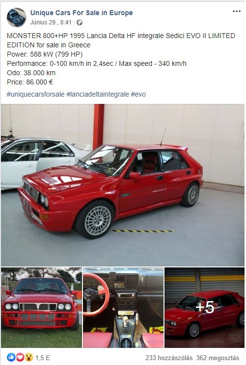 Itt van például egy Lancia Delta HF Integrale EVO II, ami már önmagában is éppen elég ritka, különleges, ráadásul pokolian megy, viszont ezt most 800 lóerősre tuningolták. A megbízhatósággal gyári állapotban is voltak problémák, nem akarom tudni, mennyire hagy ott bárhol ennyire bereszelt állapotban. Vélhetően ritkán működik, de akkor nagyon, a 340-es végsebesség legalábbis erre enged következtetni, bár erősen kétlem, hogy ezt valaha kipróbálták volna. Elnézve egy tuningmentes, jó állapotú EVO II árát, akár még meg is érheti 86 ezerért.