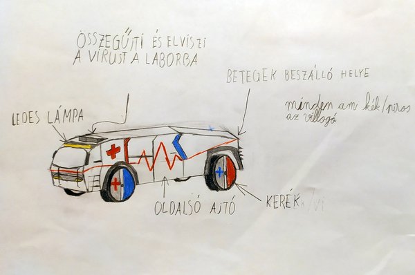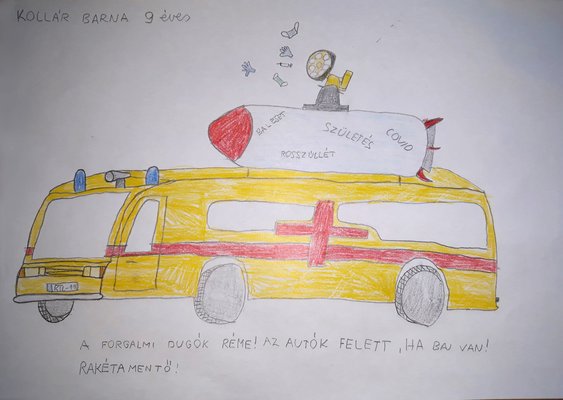Barni ennél eggyel tovább ment, külön rakéta-egységet telepített a tetőre - ha nem ragaszkodunk a sugárhajtáshoz, megkapjuk az elsősegélycsomaggal és AED-vel (automata külső defibrillátor) ellátott drónokat, már csak egy dedikált platformot kell kialakítani a Sprinterek és Crafterek tetején. Érdekes, hogy mind Barni, mind Zsigmond rajzán feltűnik a maszk/kesztyű/injekció-ágyú ötlete - ajánljuk a funkciót a Magyar Mentőszolgálat figyelmébe, mint innovációs lehetőséget.