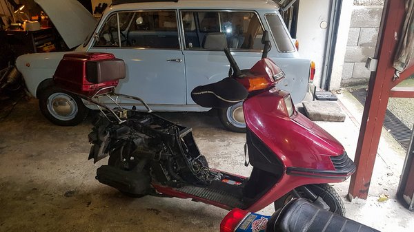Aha! Ott a Spacy! A régi ütni-vágni való, munkába menős, téli-nyári robogóm, a 33 éves Honda Spacy, amit ugyan mechanikailag minden gyanús pontján felújítottam a tavasz-nyár folyamán, de összerakás után (miután konstatáltam, hogy szenzációs lett a fékje és a futóműve) észrevettem, hogy kigyorsításnál elkezdett dadogni. Basszus. A két év állás és a k..rva etanolos benzin hozománya.