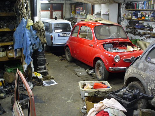 De szintén a közelgő veteránvizsgára készülve ott parkolt az ifjabb Makovecz piros 500-as Fiatja is, amit évek, talán évtizedek óta Gabi tartott karban. Az és gyerekeim abba a zuglói zeneiskolába jártak (s a kisebb jár ma is), ahol Makovecz az egyik igazgató, a hűséges kis piros Fityót pedig már vagy tíz éve mindig ott láttuk parkolni az épület mellett, néha meg is simogattuk. Az is fiatal kora óta az ő autója, végtelen sok emlékkel. Télen-nyáron azzal járt mindenhova. Mondanom sem kell, mára a Fiat is már csak egy méretpontatlan, rozsdás sziluett.