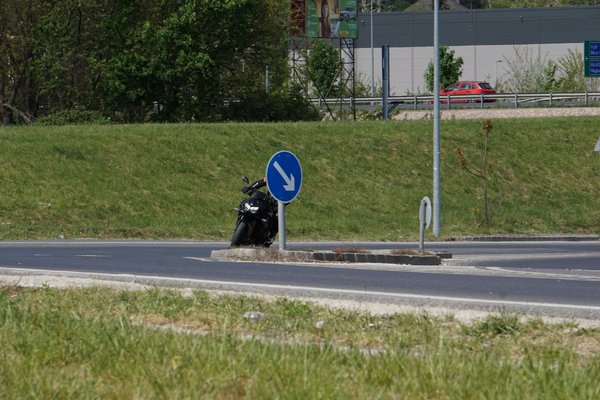 Ez a kép bizonyítja, hogy nem egysíkú művész vagyok, nem csak az elmosódásokkal és az élességgel tudok játszani, hanem egy minden pixelében éles fotón is tudok újat mutatni. Továbbra is a Z H2 van - ezúttal szó szerint is - a fókuszban, ezúttal a környezetet használva adtam többletjelentést a fotónak. A motorost kitakaró útjelző tábla szinte szájbarágósan utal arra, hogy hiába a 200 lóerő, a modern elektronikák mellett lassan nincs is szükség motorosra. A nagytotálban bemutatott környezet izglamas elemei - a belógó hirdetés, közlekedési táblák, piros autó, kiszáradt facsemete - pedig harmóniát alktonak a motor merész formatervével. (Exif infó: 1/250, F10, 114 mm, ISO100)