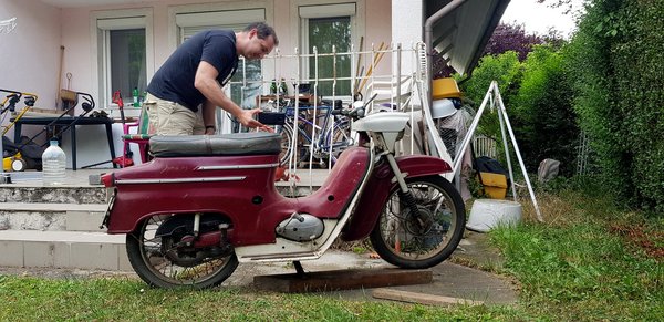 Hát nem. Újra kellett építenem és csinálnom rajta szinte mindent, mert nulláról azért még mindig a mérnökök tudnak motort álmodni a rajzasztal mellett, nem olajos kezű, nem egészen erre való mérnökök a poros garázspadlón. De sok-sok szívás után az NSU elkészült, rendszáma lett, most már megy is.