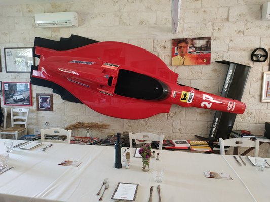 Egyből gyanús lett, amikor beléptem a terembe, ahol a terített asztal volt a legérdektelenebb dolog. A falon például egy Formula-1-es autó szénszálas kasztnija volt látható - az a bódé, ami 1989. március 26-án először ért célba.