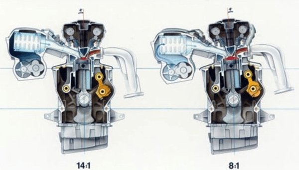 Mi értelme volt ennek a változtatgatásnak? Ukrán benzint akartak tankolni, anélkül hogy a motor kopogna? Á dehogy. A kis öthengeresre ugyanis ráakasztottak egy kompresszort is, így nagy terhelésnél, amikor a feltöltő lelkesen tolta a levegőt, csökkenteni kellett a sűrítési arányt, mivel a kompresszorral együtt már túl magas lett volna. Így jött ki a szép nagy teljesítmény minden közvetlen befecskendezéses hókuszpókusz nélkül.