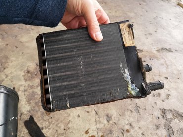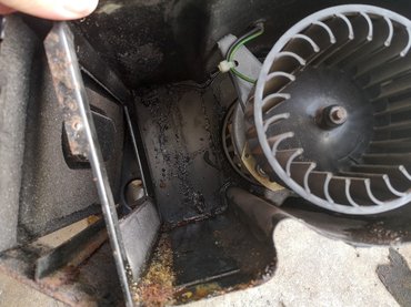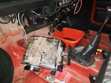 Ezzel szemben a párásodás ördögét sikerült kiűzni januárban, egy hónappal az átvétel után. Mivel semmilyen más gondot nem találtam, kizárásos alapon a fűtés mátrixban (lol, eufemizmus) kellett legyen a baj, tehát elővettem a Haynes könyvet meg a Youtube-ot, és kiderült, hogy annyira nem bonyolult ügy az. Szemben a ma forgalomban álló autók túlnyomó többségével, a fűtés nem a műszerfal mögött van, hanem alatta lóg egy pléhdobozban, amit összesen két csavar és két fül tart. A hűtőkör gumicsöveit kell lekötni két bilincs oldásával, edénybe felfogni a kifolyó fagyállót, utána már simán lejön az egész hóbelevanc, állította youtuber, szakirodalom és Balázs egybehangzón. És tényleg, pont így történt.