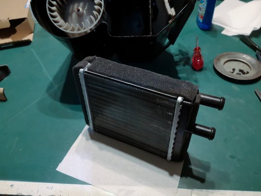Még szerencse, hogy eszembe sincs OT-ra vinni a kocsit, mert így pislogás nélkül nyúltam a ráspolyért. Viccesen egyszerű szerkezet egy ilyen Mini, a fűtőradiátort se tartja semmi a helyén, csak az, hogy körben szivacsokat kell ráragasztani, ezeket szépen odacsomagolták az új mellé. Így végül az én hiányos szerelési ismereteim is elegendőek voltak, elkészült a pléhdoboz, akarom mondani fűtés mátrix. Sőt, sikerült visszatenni elsőre úgy, hogy azóta is cseppmentes a rendszer. Bár ezt-azt csináltam már autó körül, ezzel most azt hiszem megdöntöttem a saját szerelési csúcsom.