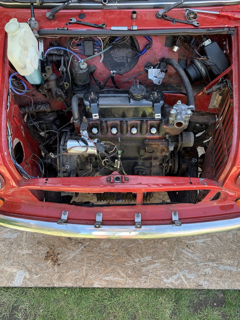 Ezután már szinte csak a daruzás marad, ami a legalább tíz éve nem terhelt csörlő ellenére tökéletesen hibátlanul megtörtént, aztán jöhetett a rendrakás. A kiürült kocsit vissza kellett rakni a kerekeire, hiszen valahogy csak fel kell gurítani majd a trélerre, amikor megy összeszerelésre. Mire mindennel megvoltunk, a nap el is ment, de az egészben nem csak az a csodás, hogy amatőr természetbúvár létünkre jelentős rontás nélkül, szinte előírásszerűen kiemeltük a motort a Miniből. Hanem az, hogy miközben ketten-hárman-négyen a kocsi körül szorgoskodtunk, addig a többieken úrrá lett az igazi kerti parti érzés: emberek, akik hónapok óta nem találkoztak élőben, ideális tavaszi időben, étellel-itallal a kezökben futhattak össze újra. Csodálatos dolog a valódi, nem monitorok előtt megélt emberi kapcsolat, és bár a szerelés miatt talán nem voltam elég jó házigazda, az arcok kisimultabban, mosolygósabban távoztak, mint ahogy érkeztek. Van azért a közösségnek varázsa na, még ha a covid meg is próbálta elfeledtettni velünk. És mellesleg a szerelés is remekül zárult, azóta már szakértő kezekben a motor és a váltó – várjuk a fejleményeket.