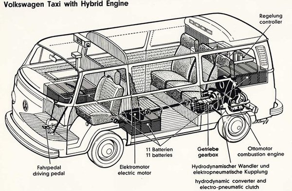 A The Complete Book of Electric Cars című könyvből túrta elő a Jalopnik azt az alig ismert Volkswagent, amely egy olyan hibrid rendszerrel volt felszerelve már negyven éve, ami működési elveiben megegyezik a mai full hibridekkel. Az autó egy taxivá alakított Type II, azaz Transporter kisbusz volt, aminek a mellékes részletei (automata, elektromosan működtetett tolóajtók, négy fotel, golyóálló (üveg)fal az utastér és a sofőrfülke között) önmagukban is érdekessé tették volna, de az igazi különlegesség a hajtáslánc volt.