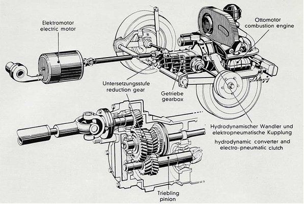 A motor a Volkswagenekből már ismert, szokásos 1600 köbcentis léghűtéses, ami a Bogárban, a Karmann-Ghiában vagy épp a Typ181-ben (amerikaiasan The Thing-ben) 50 lóerő körüli teljesítményt tudott, de a váltó némiképp eltér a szokásostól: egy plusz hajtótengely található rajta, ami egy Bosch DC villanymotorhoz kapcsolódik. A működése ismerős: vagy egy 11 akkuból táplálkozik vagy a benzinmotor-hajtotta generátorként tölti fel azokat.