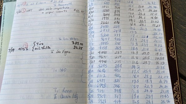 Hiánytalan a szerszámkészlet a csomagtartóban és minden gyári füzete megvan az ezüst M5-ösnek, még a szervizek számláit is eltette a gondos tulajdonos, de minden dokumentáció közül a legkedvesebb a kicsike notesz. Ebbe jegyezte fel többek között az összes tankolást és a hozzá tartozó fogyasztásokat is. Innen derül ki az, hogy az autó átvételekor beletöltött 18,5 gallon benzin 25 dollárba került.
