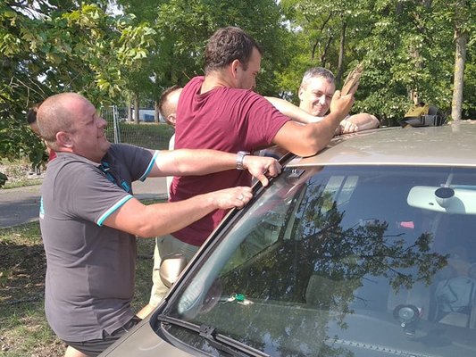 Az időközben az FB-n kiposztolt vészjelzés hatására feltűnik egy Lada klubos kolléga. Amikor kiböki, hogy nem ez lenne az első autó, amit kulcs nélkül kinyit, tisztelete jeléül mindenki egy emberként hátrál egy lépést a Borától. Ő is azonnal levette, hogy bár az ablakkeret felső részének elhúzásával kis rést tudunk ütni az autón, akkorát nem, hogy a kulcscsomót kihúzzuk rajta. Marad a kilincs meghúzása, no, de mivel? Szerencsére valaki szerzett egy vastagabb kerítésdrót darabot. Én egy deszkadarabbal járultam hozzá az események alakulásához, ami alkalmasabbnak tűnt az ablakkeret távoltartásához. Az addig próbált ágakat úgy harapta el az ajtó, mint gyerekek a sós pálcikát.