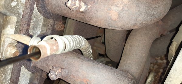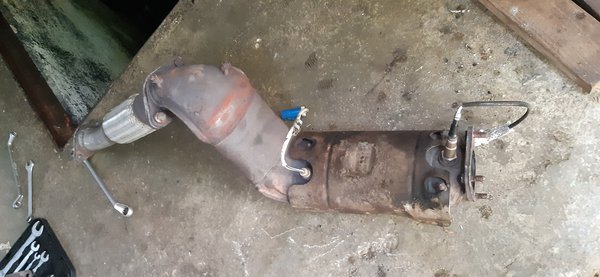 Meglepő módon ilyen szondát nem találtam itthon sehol, úgyhogy külföldről vettem egy olyat, aminek a csatlakozója is ehhez való volt. A katalizátor mögöttit minden kocsmában megkapni, de az elsőt valamiért nem. Sebaj, nem volt drága, úgyhogy amikor megjött, levettem a leömlő utáni szakaszát a kipufogónak, benne a szondákkal. Persze jó rozsdás volt a foglalat, megfújkáltam kicsit csavarlazítóval, ezzel megcsiklandozva a szondát. Mikor nekiálltam a csavarkulccsal, már hallottam, ahogy nyerítve hahotázik. Rámelegítettem a gázlámpával, ettől már talán nyújtózkodott is egyet, mielőtt a fal felé fordulva lepihent, hogy hagyjam már békén a hülyeségeimmel. Ilyenkor jön a nincs visszaút hadművelet...