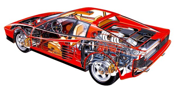 Egyszerű, mégis baromi jellegzetes a Testarossa, melynek tervezőcsapata a Pininfarinánál Ian Cameron, Guido Campoli, Diego Ottina és Emanuele Nicosia volt, méghozzá az aerodinamika tudományában otthonosabban mozgó Leonardo Fioravanti vezetése alatt. 0,36-os légellenállási együtthatója beelőzte a Lamborghini Countach 0,42-jét és a Testarossára nem kellett utólag hátsó szárnyat eszkábálni. Az eredeti cél az volt, hogy az oldalsó légbeömlők méretét a lehető legkisebbre szorítsák, de a 4,9 literes, 12 hengeres motor azért igényli a levegőt. További nehézség volt, hogy ezek a nyílások az amerikai biztonsági szabályozások miatt nem maradhattak teljesen nyitottak, ezért született meg az ötlet, hogy a karosszéria síkjában hosszanti, színre fújt bordák húzódjanak. Ez végül annyira meghatározó elem lett, hogy a ‘80-as években minden nagyjából mindenre született hasonló bodykit.