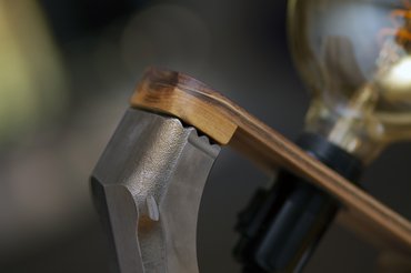 Miután megvolt a talp keresztmetszeti megmunkálása, jöhetett a csiszolás: a nagyját szalagcsiszolóval és 80-as papírral gyorsan letudtam, majd jött az időigényesebb rész, excentercsiszolóval 120-180-240-320-as szemcsemérettel végigmentem rajta, a lépések között nedves ronggyal felhúzva a szálakat, aztán a végén egy merész gondolattól vezérelve felraktam a 400-as papírt is. Nem indokolta a feladat, de mozgatta a fantáziám, mit lehet kihozni a dióból. A végén az olajozás jelenti számomra a korona felhelyezését, a gondosan csiszolt felület életre kel, ahogy beeresztem keményolajjal. Hirtelen előugrik a színe, a texturája, ragyogni kezd az egész. Ennek is megvan a maga trükkje, alaposan vissza kell törölni a felületet, különben ronda lesz. Míg száradt az olaj, levezetésnek féktisztítóval és scotch brite-tal lepucoltam a hajtókart, aztán elégedetten próbáltam a helyére: jó lesz már csak a lámpa része hiányzik.