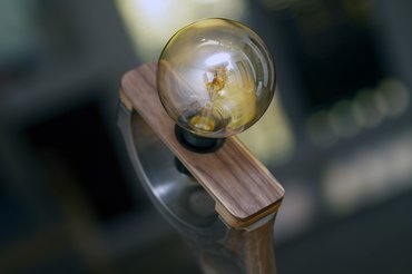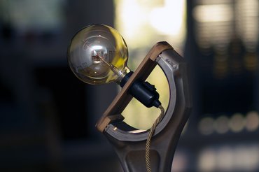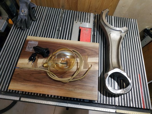 Egy ilyen tárgynál az apróságokon múlik, hogy a végeredmény gagyi lesz-e, ezért igyekeztem odafigyelni a részletekre. Mivel a hajtórúdban nem tudom rejtve vezetni a kábelt, az is a látvány része, adta magát, hogy színben passzoló, textilszövésűt válasszak - a dióhoz vasalatból is jól megy az arany és a réz. Egy merészebb bordó, lila vagy zöld lehet, hogy nagyobbat üt, de nem véletlenül nem esztéta vagy dizájner vagyok, a biztonsági megoldást választom. Lőttem mellé egy normálisabban kinéző villásdugót és egy fekete foglalatot. Utóbbiból végül olyat választottam, ami egyben van a kapcsolóval, ezzel még minimalistább lesz, illetve nem kell még egy elemnek az elhelyezését kitalálni.