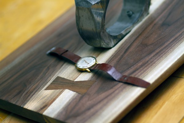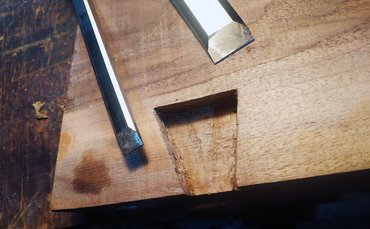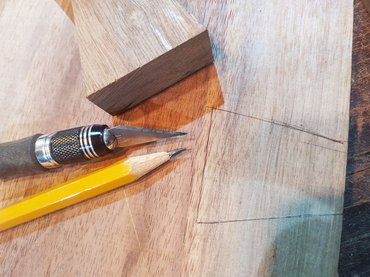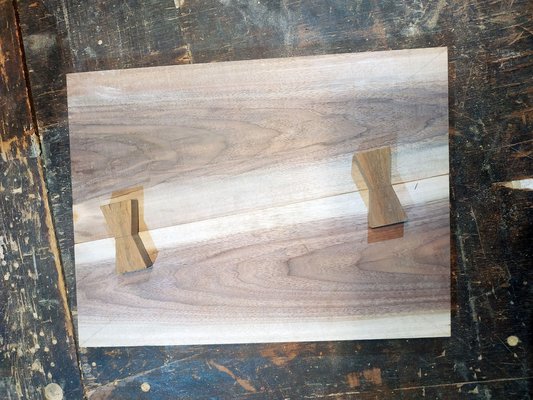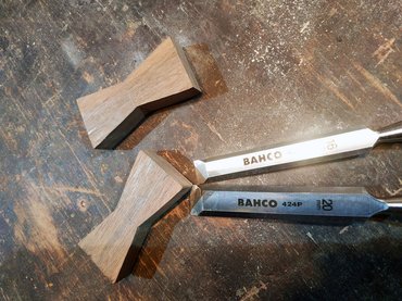 Egy szintén kallódó, bő tenyérnyi másik dióból pont kijött két bowtie joint - ezek a nyakkendő alakú berakások a két anyag találkozásánál. Ezt a technikát alapvetően a fa repedéseinek a rögzítésére használják, de itt inkább esztétikai szerepük van. A bowtie joint elkészítése nem bonyolult, a masnikat japán fűrésszel kivágom, a deszkára téve körberajzolom őket, majd a vonalon belül maradva felsőmaróval kiveszem a nagyját, a széleket pedig vésővel megigazítom. Ragasztás előtt érdemes a masnik alsó éleit lekapni, egyfelől így könnyebben becsusszan, másrészt marad hely a ragasztónak.