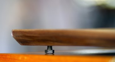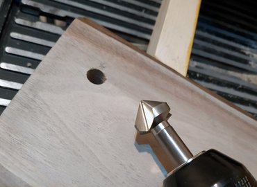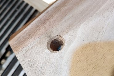 Mivel a talp két egész deszkából áll, és nem merevítettem ki alulról hevederrrel, borítékolható, hogy idővel vetemedni fog. Hiába műszárított anyag, hiába lesz felületkezelve, a fa nem marad nyugton. Most ugyan sík, de ez nem lesz mindig így, ezért arra jutottam, érdemes állítható kis lábakat tenni alá, hogy ne billegjen majd az asztalon. A négy sarkához ezért tessauer anyákat tettem - kell nekik egy-egy 10-es furat, abba egy imbuszkulccsal be lehet őket hajtani, belül pedig van egy M8-as menet, ahová mehet a megfelelő csavart, vagy éppen lehet venni hozzá kicsi bútorlábat.