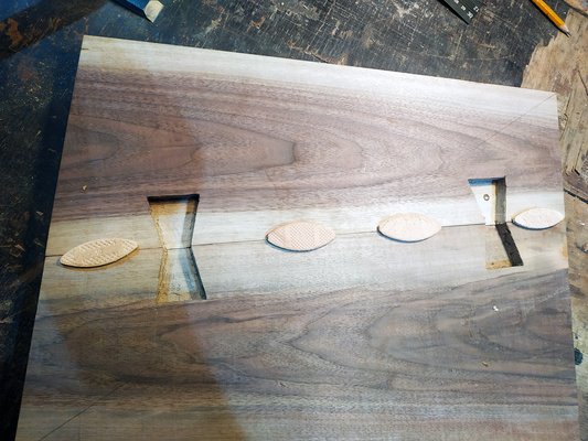 A két amorf darab szélein csak annyit igazítottam gyaluval, hogy szépen egymásnak simuljanak, a szabályos téglalap forma nem volt szempont (nem is lett az), nem igazítottam méretre, meg akartam őrizni a természetes széleit. Ennek főleg esztétikai oka volt: tetszik, ahogy kontrasztosan különválik a világos és a sötét rész - a világos, növekedésben lévőt szíjácsnak hívják, a belső, sötétebbet pedig gesztnek. Miután megvolt a forma, meggyalultam a deszkákat, aztán ragasztóval és lamellóval (asztalos célszerszám, olyasmi, mint egy módosított flex, amivel kicsi, ellipszis alakú bükkfa korongoknak lehet kimarni a helyét, amiket beragasztva nagyon erős kötést tudunk létrehozni lapok között) összeraktam őket.