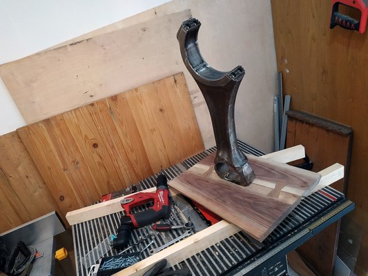 A bowtie kilógó részét kézi gyaluval gyorsan lecsaptam, majd jöhetett a hajtókar elhelyezése. Az nyilvánvaló volt, hogy az olajozófuratoknál fogom csavarral rögzíteni, de a biztonság kedvéért belemartam a talapzatba, hogy biztosan álljon - szintén a biztonság jegyében ekkora maga a talp is, 12 kilós hajtókarról van szó, ha ez leborul, pusztít. A marás után egy csavarral átjelöltem az olajozófuraton, hova kell fúrni. Egy sima pozdorjacsavarral is rögzíthettem volna, de ide lemezcsavar illik.