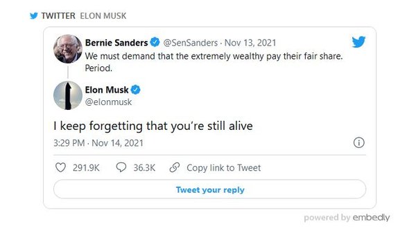 A hírhedten nagy Twitter-troll Elon Musk új mélységbe lépett az odaszúrt válaszok műfajában. "Mindig elfelejtem, hogy te még élsz." - írta válaszul Bernie Sanders szombati Twitter-bejegyzésére, amiben a 80 éves szociáldemokrata politikus arról írt, hogy az USA nagyon gazdag polgárainak jobban ki kellene venniük a részüket a közös teherviselésből, azaz több adót kellene fizetniük - a járvány alatt óriásit nőtt - vagyonuk után.