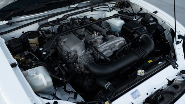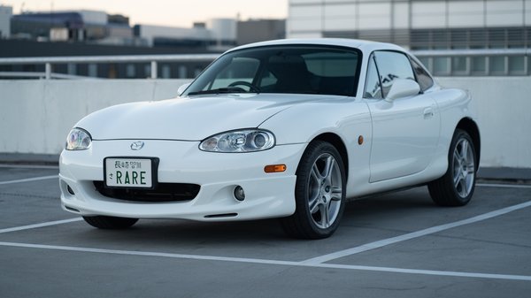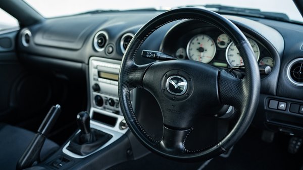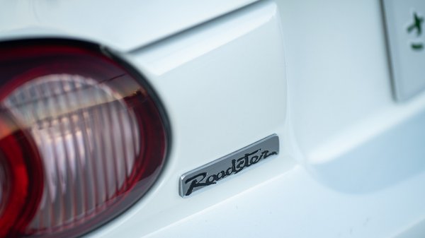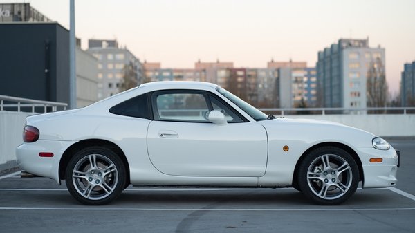 79 ezer kilométerrel is nagyon patikának néz ki és rozsdamentes is a hófehér MX-5-ös, amiben az 1,8 literes, négyhengeres motor 160 lóerős változata van, felette toronymerevítővel, hozzá hatsebességes kézi váltó kapcsolódik és a mókát biztosító sperr. A 16 colos Enkei felnik mögött kivillannak a keményebb Bilstein B6 gátlók, ami remek irányba fejleszti a Miata futóművét.