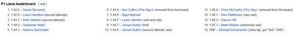 A legjobb körök listáján gyorsabb, mint a Skoda Fabia RS, a Toyota Avensis, Renault Laguna, Jaguar X-Type. Az olyan anomáliákról már ne is beszéljünk, hogy a Ferrari F40-es el sem tudott indulni, mert a rajtnál lerohadt. Hihetetlen mennyiségű sztár vezette a Suzukit, 66 power lap idejét mérték le, de ezen felül még az F1-es pilóták köreit is ezzel teljesítették. Sőt, miután a Lianát lecserélték a Lacettire, Ceedre, majd Astrára, az F1-esek továbbra is a Suzukit kapták meg.Íme az egyik legendás epizód, amelyben Michael Schumacher...