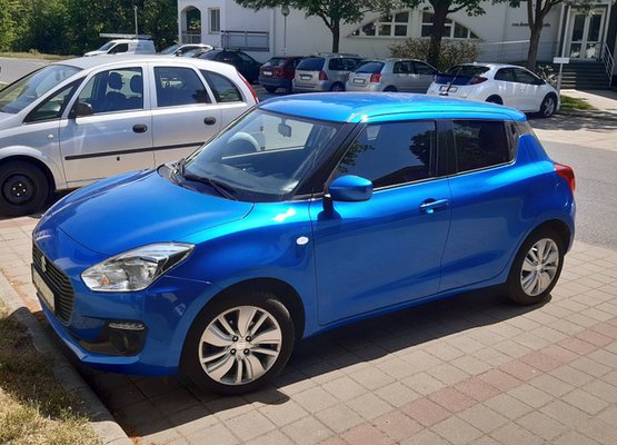 Mindenképpen valami vidám, színes autót szeretett volna az asszony az ezüst (=szürke) Yaris után, ezért először nézegettük a tipikus Mazda-bordó Mazda2-ket is, ami nagyon tetszett neki. Formás kis autó, de hátul elég szűkös, és a 75 lóerős elég enerváltan mozgott, a 90 lovast meg nagyon drágán árulták. Aztán egyszer a közelben hirdettek egy kék Swiftet, mondtam a feleségemnek, hogy nézzük meg, próbáljuk ki, aztán majd meglátjuk. Eredetileg nem is akarta lecserélni a Yarist, mert bár 13 éves volt, kevés volt benne a kilométer és semmi baja nem volt. Aztán mikor meglátta a Swiftet, és pláne mikor ment vele egy próbakört, egyből szerelmes lett bele. Így aztán meg is vettük 3,5 évesen, hibátlan állapotban.