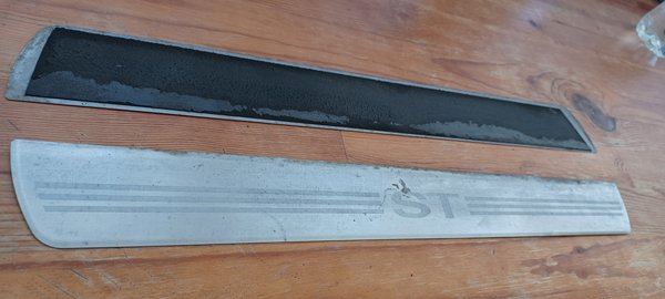 A múltkori szobrászkodás után feltűnt, hogy a küszöbdíszeket nem rakták vissza a májsztrók, úgyhogy azt még meg kellett tennem. Zavart, hogy nem látom minden alkalommal, hogy ST-be szállok be, még a végén asziszem, hogy ez csak valami öreg Focus, nem pedig azt, hogy egy öreg és sokat fogyasztó, ritka Focus, amibe egy vagyont lapátoltam már, ráadásul örömmel, és még nem tudtam, mi vár rám. A lécek kétoldalas ragszalaggal vannak rögzítve, és csak annyi volt a gond, hogy el kellett távolítani a díszlécekről a régit, amiből volt rajtuk bőven. De kaptam a tippet, hogy mivel érdemes próbálkozni, acetonos körömlakkleszedővel. Szóval mással ne is próbálkozzon senki, mert csak szenvedni fogtok, mint én az elején, ezzel viszont pikk-pakk le lehet kaparni.