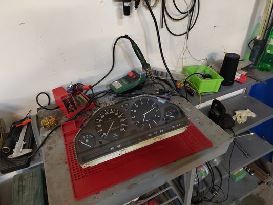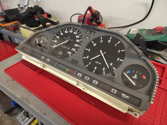 Megvolt az egy hónap, az E30 bizonyított egy cimborám esküvői autójaként, voltam vele egyet kirándulni, leműszakiztattam, és gurultam még néhány kört, aztán eldöntöttem, a szórakozás után dolgozni is kell, itt az ideje nekiállni. A beavatkozásokat a kilométer-számlálóval kezdtem, szétszedéskor rájöttem, hogy egy üdítően egyszerűen szerelhető, és mai értelemben nagyon kevés patenttel összerakott beltere van a kocsinak, körülbelül fél óra csavarozás után kezemben is volt a mechanikus működésű, de elektromos vezérlésű óracsoport.