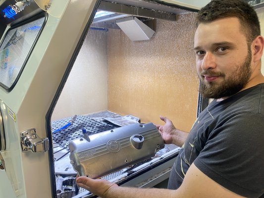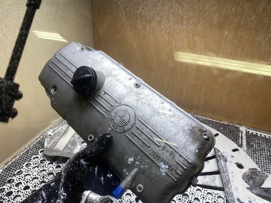 Ebédközi desszertnek, motivációm fenntartására elmentem Sipos úrhoz, hogy az oxidált alkatrészeim új életre kapjanak. Zoli készségesen elmesélte, hogyan működik a nedves szemcseszórás, a 6 bar levegővel és vízben úszó szemcsékkel operáló rendszer elég meggyőző és nagyon jól kitalált szerkezet, elég hatékony oxidált alumínium alkatrészekre, alig bántja az anyagot, de gyönyörűen tisztít, és a kapott felület nagyon közel lesz egykori eredetijéhez, a gyöngyszórtnál mattabb, de a sima homokszórtnál frissebb és természetesebb felületet kölcsönöz az alkatrészeknek.