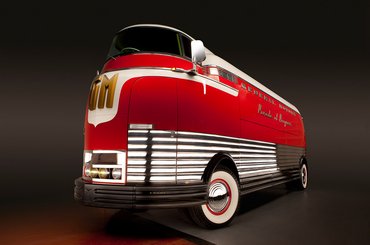 A forma többi részét is az ívek és egyenesek ügyes összhangja határozza meg: például a hátulja leginkább a Mallard gőzmozdony aerodinamikus elejére hasonlít leginkább. Az alsó rész feketéje a mai SUV-k optikai hasmagasság-növelő trükkjét idézi, a lökhárítóknál némi dodzsemes beütéssel. A hatalmas, krómozott oldalsó betéteknél már csak a komikusan gigantikus méretű GM-logó a feltűnőbb, de nem nehéz elidőzni a Futurliner többi csodálatos részletmegoldásánál sem. Tehát van benne némi mozdony, egy kis Airstream lakókocsi, némi busz és egy csipetnyi teherautó is. A végeredmény mégis valami egészen egyedi, máshoz nem hasonlítható dolog, ami igazából egy mozgó, art déco szobor.