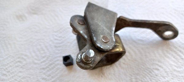 Szóval ezzel az egységgel volt a gond, az ezen lévő egyik gömbfej végét húzkodjuk a bowdennel, amikor jobbra-balra mozgatjuk a váltókart. Itt egy csapszegen van egy műanyag kocka, ami egy nútba megy bele a rudazaton, ezáltal cincáljuk ki és be a rudazat tengelyét. Belátható, hogy ha ez a kocka elfogy, akkor holtjáték keletkezik, ezért a bowden változatlan hossza miatt kevésbé tudjuk mozgatni ki és be az egész rudazatot. Ami pedig itt egy néhány mm-es holtjáték, az a váltókarnál már sok centit jelent. Nálam már nemhogy a kocka, de a csap is félig elfogyott, amikor egyszer érdekességképp kivettem, hogy ránézzek.