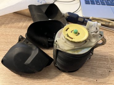 Nézzük az öveket! Az öv amikor kiszerelésre került, összeugrott. Van benne egy kis mechanika, ami nem engedi, hogy egy esetleges baleset után újra használni lehessen. Itt azonban nem volt ilyenről szó, úgyhogy meg kellett szeretgetni a kis dobozt belülről. Nem egy nagy dolog ez sem, leültem, megnéztem 1-2 YouTube videót és már szereltem is össze. Az övek viszont elég koszosak voltak, úgyhogy beszerelés előtt kaptak még egy kiadós tisztítást is. Csináltam vagy két éve erről egy videót, berakom ide alulra, ugyanígy jártam el most is – azóta is szépen visszacsévélődik (most könnyebb is volt, mert ki volt szerelve).