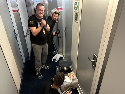 De mit érdekelt minket a napi három étkezés, ha egyszer nem volt a menün egy rendes újévi lencse, füstölt kolbásszal? Laci már előző este felvázolta a tervet: kell keresnünk valami közösségi teret, ahol van 230 az indukciós főzőlapnak, és ahova nem ragad be a kajaszag: volt szó az éppen kihasználatlan, ülő utasok számára szolgáló nagy teremről, még a bár legsötétebb sarkáról is, de végül az egyszerű megoldást választottuk: a kabin előtti folyosóra lógattuk ki a kábelt, és úgy készült el a speciális, kolbászos-szalonnás-virslis lencsefőzelék éthordós habarással, dijoni mustárral, Á la Bunkoczi. Isteni volt, szerintem a két nap fénypontja volt, videós pajtásunk, Ádám segítségével még kenyér is lett hozzá a büféből, mert azt pont elfelejtettünk vinni.