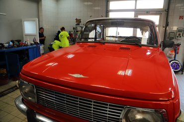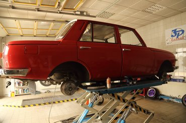 Most Szilárd Svédországot Savariára váltotta és új projektbe kezdett 3P Garage néven. Én egy fantasy Trabanttal érkeztem hozzá, amely leginkább a Mad Max járgányaira hajaz, de a legtöbb ötletet a marokkói király által üzemeltetett tömegoszlató autókból merítettük. Na, itt Szombathelyen, a kínzócölöpön most egy Wartburg szenvedett, ugyanis épp valami brutál kipufogó szerkezetet próbáltak alá.