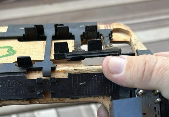 Mint később a fotókról kiderült, egy A1406830086-ra lett hirtelen szükségünk – vagyis arra a legendás, soha senki által se látott, ámde beszerezhetetlen pöcökre, ami nélkül a világ nem lenne ugyanaz. Ez a dugóhúzó formavilágú műanyag rögzíti a hétrétegben lakkozott, sablonban feszített-ragasztott, felmelegített majd lehűtött, több rétegű rózsafa betétet a váltókar körül, a könyöklő felőli végnél, hogy szépen simuljon, ne álljon ki bután, és ne tűnjön csálénak, ha valaki benéz az utastérbe. Így: