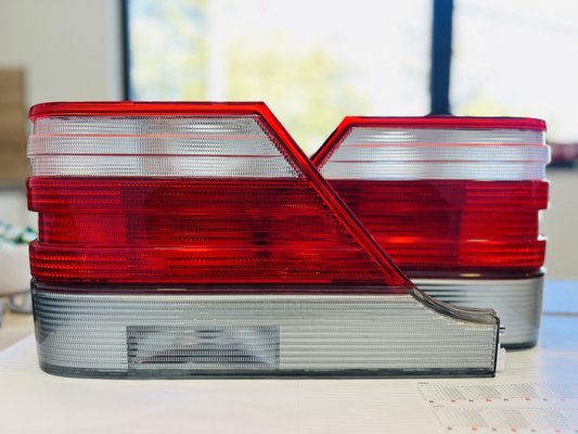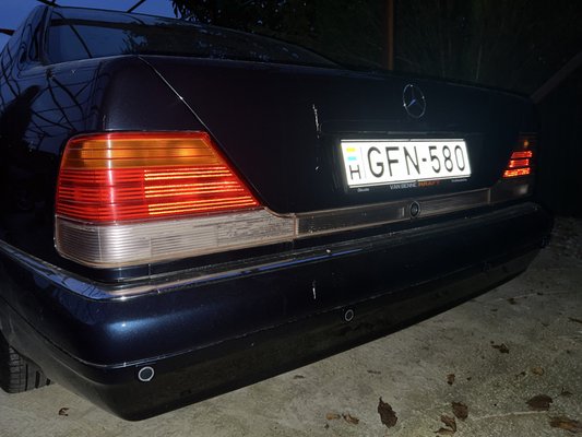 Na és akkor a lámpák. A W140-es bálna hátulját igazán a hátsó világítótestek és az azokat összekötő prizma teszik jellegzetessé, persze csak addig, amíg szépek. Idővel viszont beáznak, a retek valahogy bejut a búra alá és megtelepszik, a többit meg elintézi az UV, aminek köszönhetően szép lassan rózsaszínné fakul az egész.