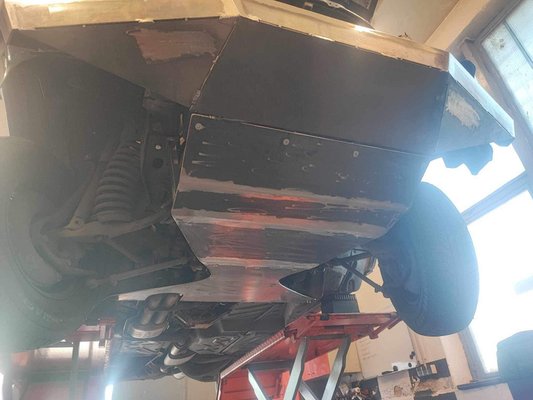 Az első lökhárítótól lefelé 4 mm vastag lemezből csináltattunk haspajzsot, a hátsó lökhárítót pedig elengedtük, vagyis eredetileg a természet tépte le, mi pedig már nem raktuk vissza. Felszabtuk a hátsó íveket is, a hátfalat pedig teljesen eltüntettük egészen a lámpák vonaláig. Miért? Hogy valamelyest kompenzáljuk a hosszú túlnyúlást. Az autó feneke végül egy csúszólemezt kapott, szintén 4 milliméteres anyagból, mert ha majd leér, akkor érjen le stílusosan és lehetőleg ne deformálódjon el. Plusz előnye, hogy a homok, ami eddig szeretett volna bejutni a testbe, most a tervek szerint kint marad.