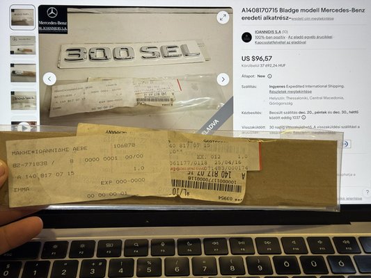 Még hétfő dél körül rendeltem meg Thessalonikiből egy gyári, new old stock SEL300 feliratot úgy negyvenezerért a Bálna farlemezére, és másnap reggel tízkor már ott is volt az asztalomon. Nem tudom, hogy a DHL hogy csinálja, de az biztos, hogy a Magyar Posta sokat tanulhatna tőlük.