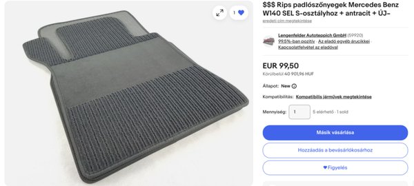 Na, ilyet nem akartam, és kész szerencse, hogy egy sorstársam, akit hívjunk most csak Edinek, szóval Edi küldött egy linket, ahonnan ő jó minőségű, klasszikus Mercedes szőnyeget tudott rendelni nem is túl drágán, ráadásul a gyári anyagokból a gyári varrással a gyári színben. Nem volt hát mit tenni, néhány napig még kotlottam az árnyalaton, végül a teljesen fekete helyett az antracit szürkét kértem a Lengenfeldtől, mert azon nem látszik meg azonnak a por, és a padlókárpit amúgy sem teljesen fekete. Jelenleg épp úton van.