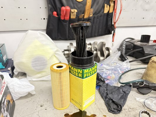 Szóval rendeltem egy olajcserét, egy karter-tömítés cserét, meg egy új légszűrőt. A jó hír végül az volt, hogy az olaj nem is a kartertől folyt, hanem a hosszában elrepedt kartergáz csőből pötyögött ki a felesleg, úgyhogy ezt kellett újra cserélni, a légszűrő pedig majdnem új volt. Utóbbi viszont már nem teljesen mondható el a slim-fit olajszűrőről, ami nem is tudom, hogy hogy nézhetett ki így, de azt egész biztosan sejtem, hogy mennyit szűrhetett: