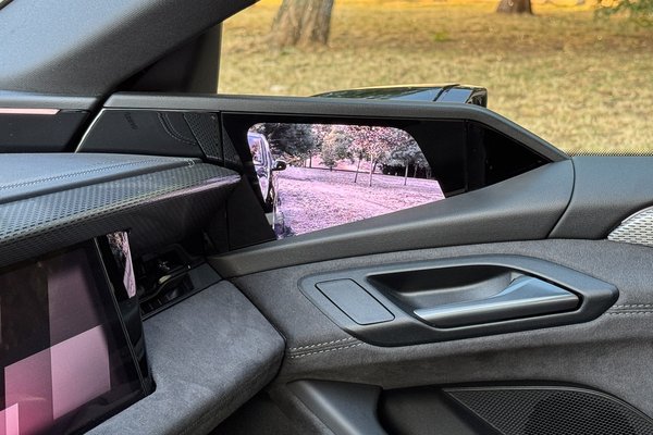 Ülök ebben az A6-ban és rendesen golyózik a szemem a kijelzők között. Reflexből kinézek a tükörre, konstatálom, hogy az csak egy amorf csonk egy csöpp kamerával, majd keresni kezdem a belső kijelzőt. Bent van az ajtókárpit felső élén, olyan 20-25 centivel beljebb és 10 centivel lejjebb, mint a külső tükör lenne. Elvesztem a periférikus látásom élességét és még bele is zavarodom a kijelző képébe, mert a baloldali egyáltalán nem felém néz. Ezt mégis hogy gondolták? Persze, így adja ki a műszerfal dizájnja, de kábé 45 fokos szögből ránézni egy monitorra akkor is frusztráló, ha egy tévéről van szó. A másik még oké, síkban nagyjából merőlegesen felém áll.